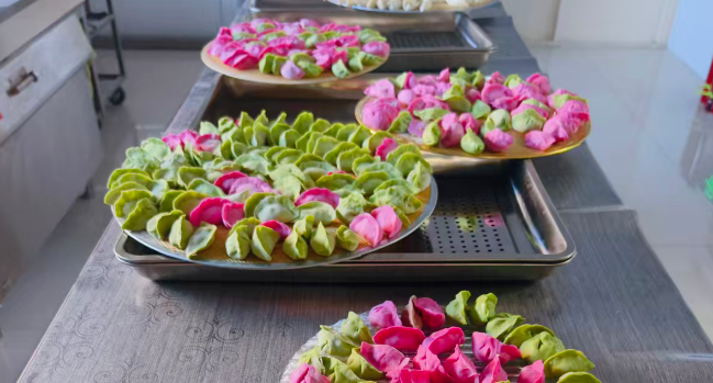 活动伊始,“礼赞祖国文艺汇演”温情启幕。除了嘹亮的《我们走在大路上》合唱、灵动的《我和我的祖国》舞蹈,孩子们还带来了手势舞《今天是你的生日》。他们小手轻抬、指尖翻转,稚嫩的脸庞满是庄重,将对祖国妈妈的生日祝福融入每一个细腻手势,掌声与轻声跟唱交织成温暖的乐章。文艺汇演后,“‘饺’遇中秋爱伴成长”亲子活动接力开启。活动室里,面团、馅料整齐摆放,家长与孩子默契配合:有的揉面擀皮,有的包馅捏形,一个个形态各异的饺子在欢声笑语中诞生。孩子们脸上沾着面粉,却笑得格外灿烂,不仅体验了动手的乐趣,更在协作中感受了中秋团圆的意义。