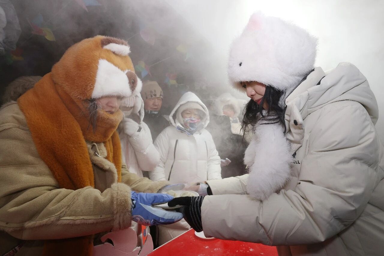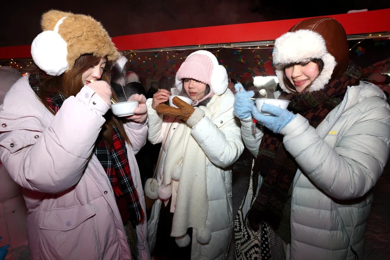 室外的暖心市集烟火气十足,烤地瓜、烤串等特色摊位香气四溢,免费的姜茶、鱼汤、暖贴也让游客在寒冷中感受到贴心暖意。千人饺子宴也是跨年夜的重头戏,游客们品尝用漠河本地出产的面粉、酸菜、猪肉制作的热腾腾饺子,了解漠河最新推出的4条精品旅游路线,感受“更岁交子、团圆安康”的美好寓意。“在这里的跨年氛围非常热闹,年味很足,这里的人非常热情,还发了暖宝宝,给大家煮饺子吃,天很冷,但心里暖暖的。”来自海南的游客钟意说。