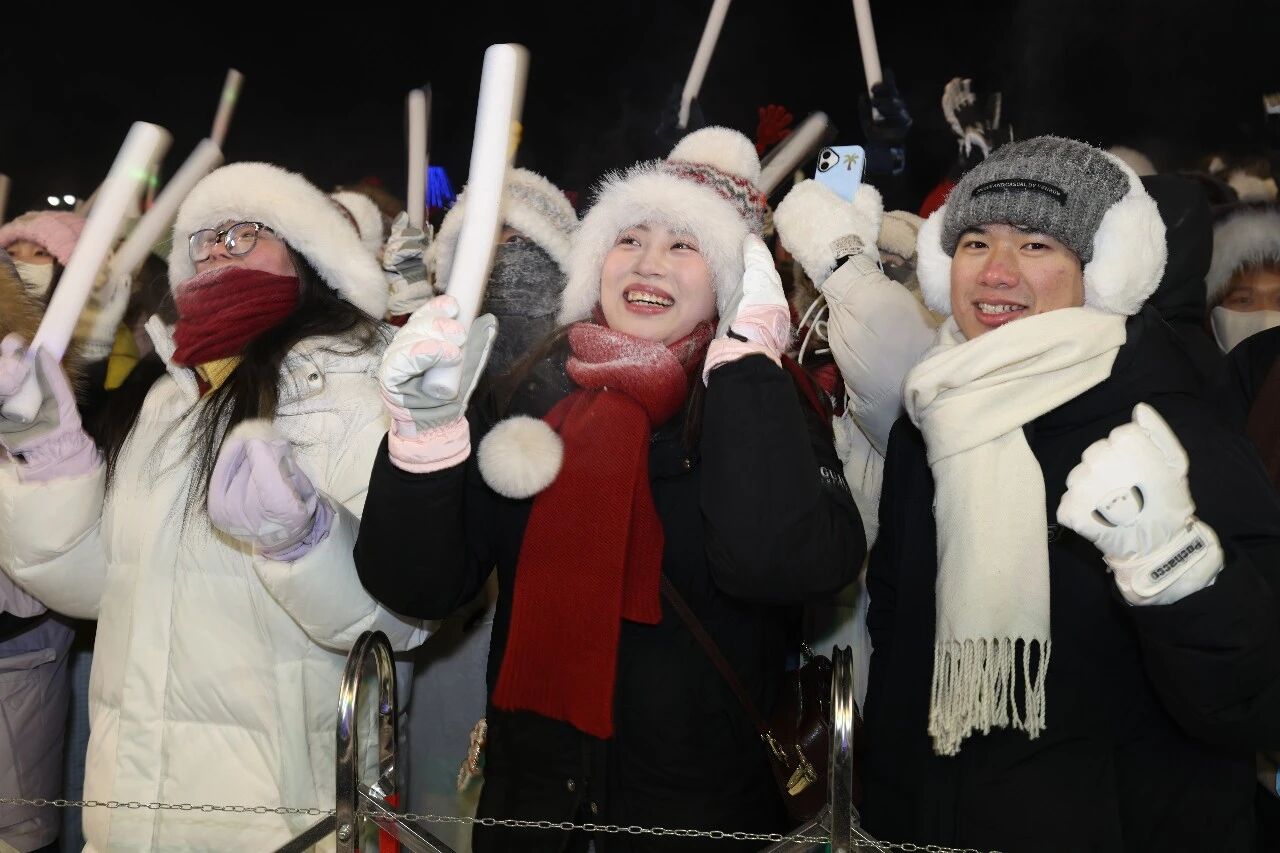 潮流与民俗的碰撞让跨年夜更具看点,《泼洒梦想》《要爱你就来》等歌舞表演点燃全场热情,荧光棒点亮夜空。随后,《小拜年》等东北二人转经典选段轮番登场,演员们手持手绢、扇子载歌载舞,现场欢声笑语弥漫。“第一次在这么冷的地方跨年,热情可以把整个场子都点燃。”来自山东的游客陈佳欣兴奋地说。