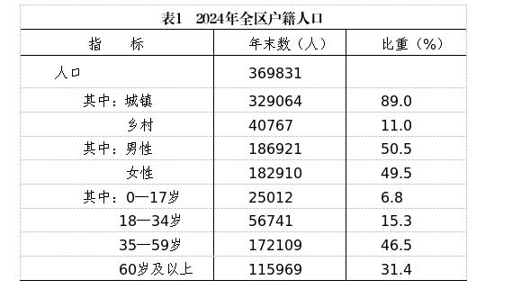 户籍人口。据公安年报数据显示,全区年末总人口369831人,出生人口851人,出生率2.27‰;死亡人口3696人,死亡率9.88‰;人口自然增长率-7.61‰。