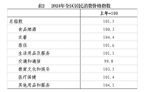 物价水平。2024年,全区居民消费价格指数(CPI)比上年上涨1.5%。
