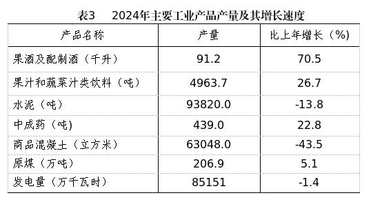 工业生产。规模以上工业企业为28户,比上年同期增加3户。规模以上工业增加值下降2.2%。从三大门类看,采矿业增加值下降5.3%,占规模以上工业增加值比重为68.0%;制造业增加值增长8.6%,比重为13.0%;电力、热力、燃气及水生产和供应业增加值增长2.9%,比重为19.0%。从产品产量看,果酒及配制酒产量91.2千升,增长70.5%;果汁和蔬菜汁类饮料产量4963.7吨,增长26.7%;水泥产量93820.0吨,下降13.8%;中成药产量439.0吨,增长22.8%;商品混凝土产量63048.0立方米,下降43.5%;原煤206.9万吨,增长5.1%;发电量85151万千瓦时,下降1.4%。