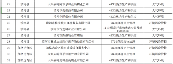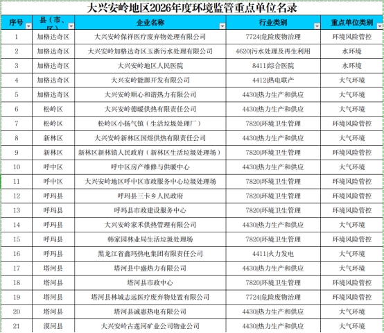 按照《企业环境信用评价办法(试行)》及省生态环境厅企业环境信用评价有关工作指导意见,经对照梳理,大兴安岭地区纳入2026年生态环境信用评价参评企业共31家。企业名单如下特此公示: