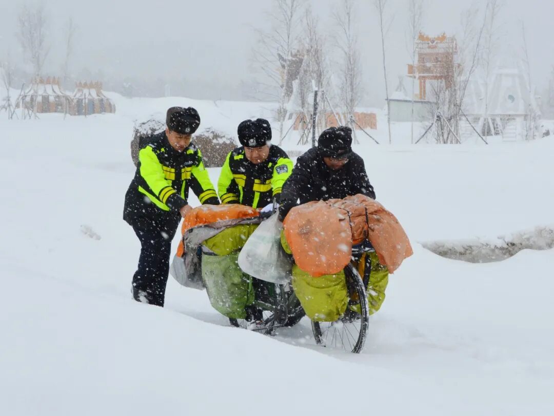 事发当日,巡逻民警沿G111国道与S301省道开展例行路面巡查,当车辆行驶至北服务区奥伦公园附近路段时,发现一名男子正推着陷入雪堆的自行车,在寒风中步履艰难,神情十分焦急。民警立即停车上前询问情况,经了解,该男子是外来骑行爱好者,因对当地路况不熟悉,不慎将自行车骑入路边积雪深处,多次尝试自行推车均未成功,独自被困在风雪中。