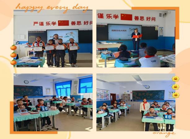 吴桂莲老师以趣味闯关的形式开展“民族文化大闯关”活动,带领大家深入体验了丰富多彩的民族文化。活动共设四大关卡。第一关“服饰配对”,引导学生识别各民族的特色服饰,增强了大家对民族服饰文化的直观认识。第二关“歌曲猜名”考验学生的音乐辨识能力与文化背景知识。第三关“节日连线”聚焦民族传统节日,让学生理解不同节日的习俗与内涵。第四关“风险题”,帮助学生了解不同民族的建筑风格。本次活动寓教于乐,学生在轻松愉快的氛围中不仅巩固了民族文化知识,增强了对中华民族共同体的认同感与自豪感。