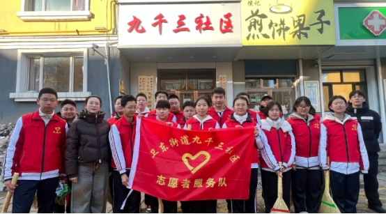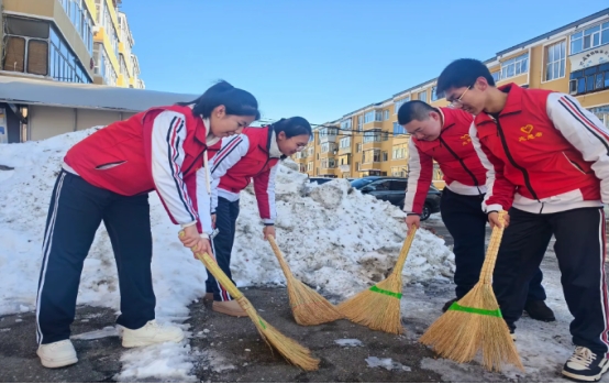 初春寒意未消,大家挥动双臂清扫社区积雪,劳动场面热火朝天,保障居民出行安全。