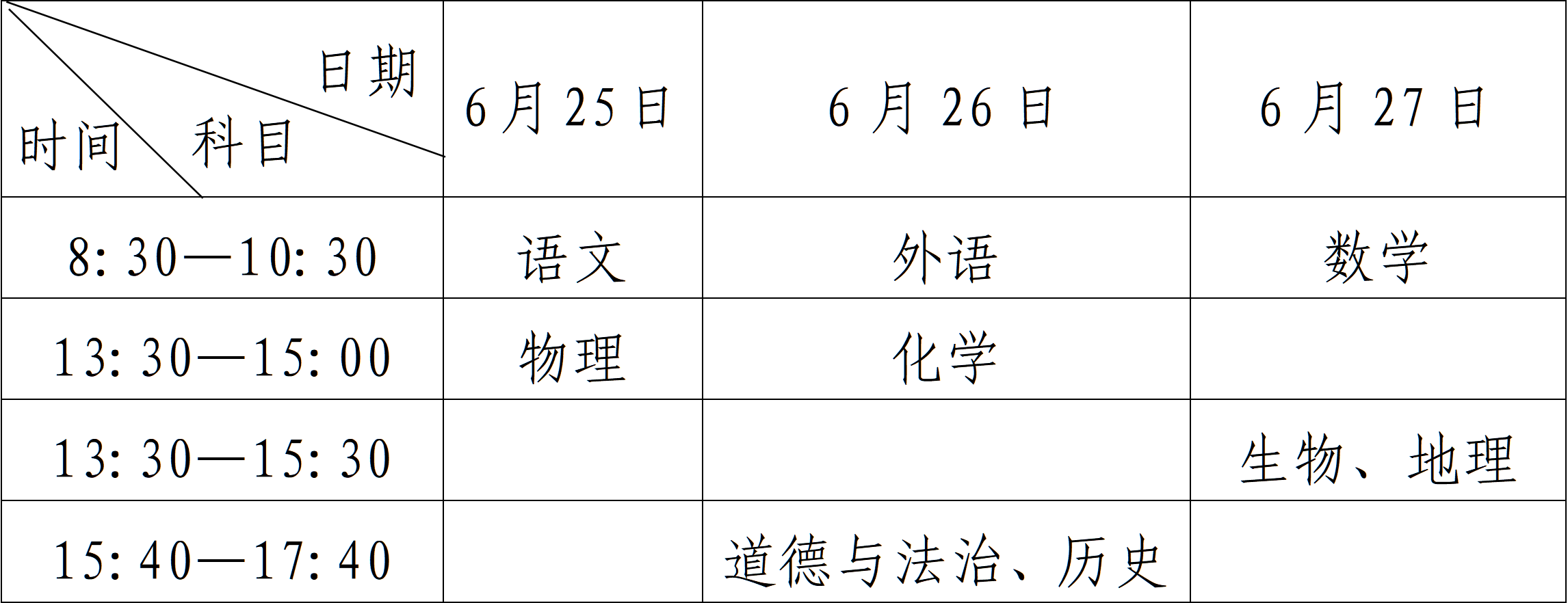 2.考试时间。全区初中升学考试时间为6月25日—27日,具体安排如下。