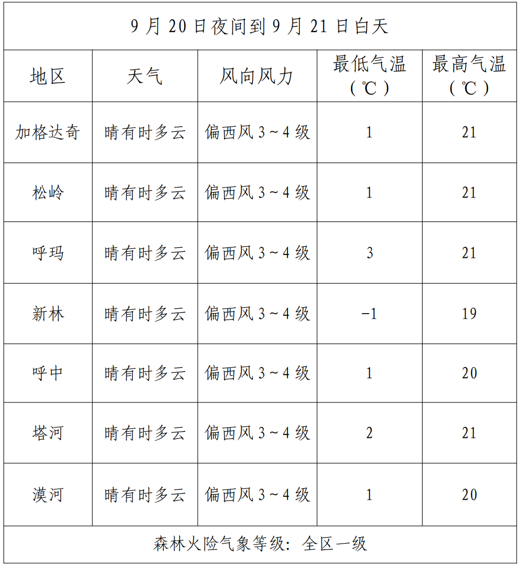 9月20日夜间到9月21日白天全区天气与森林火险预报