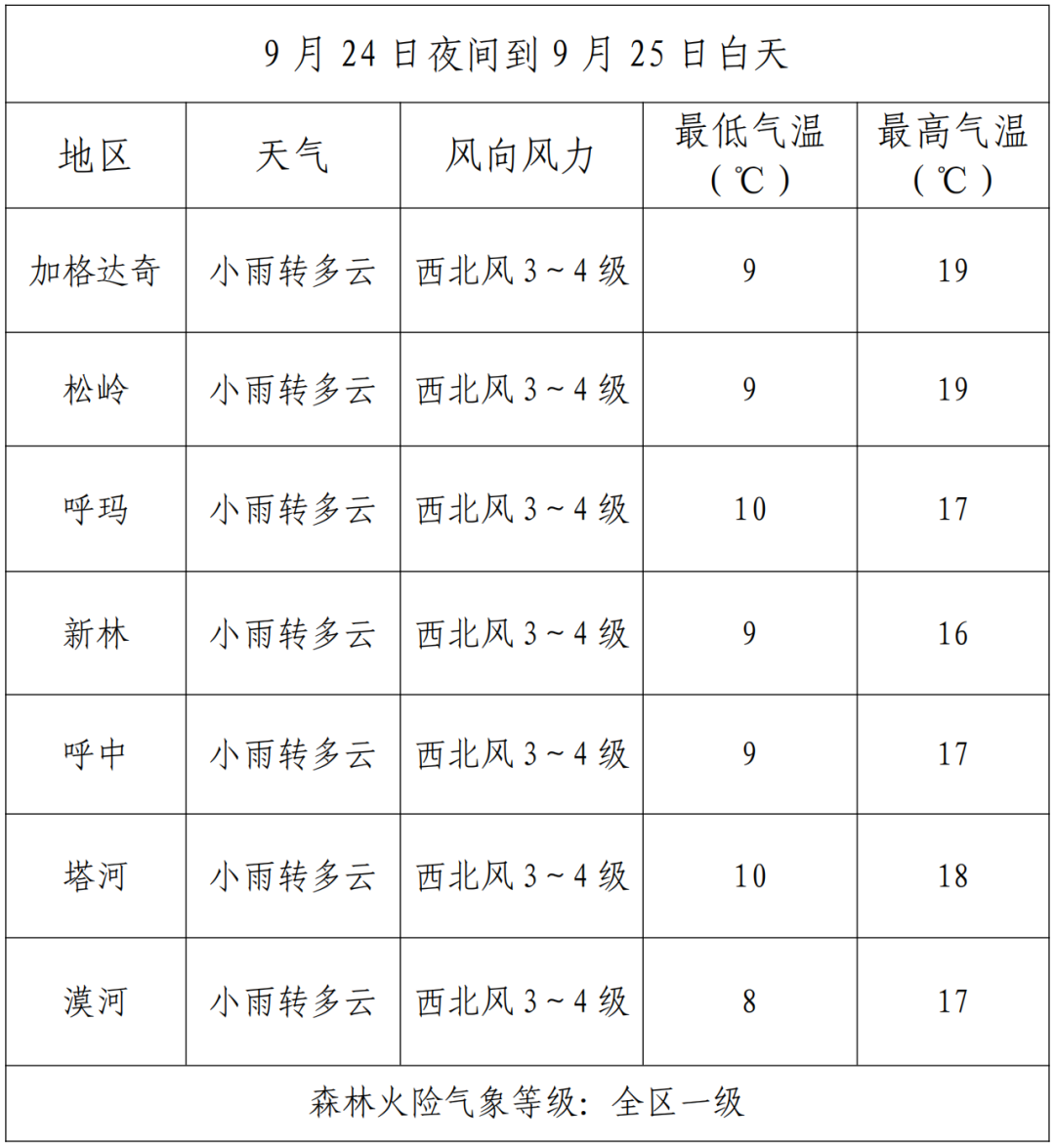 9月24日夜间到9月25日白天全区天气与森林火险预报