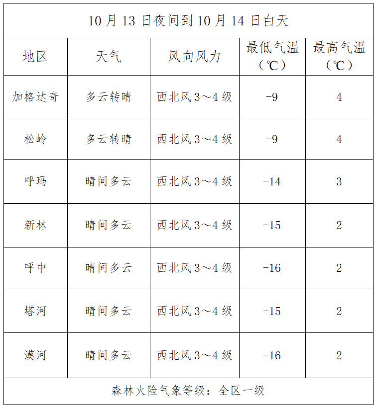 10月13日夜间到10月14日白天全区天气与森林火险预报