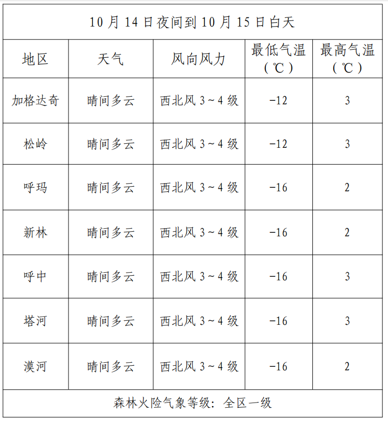 10月14日夜间到10月15日白天全区天气与森林火险预报