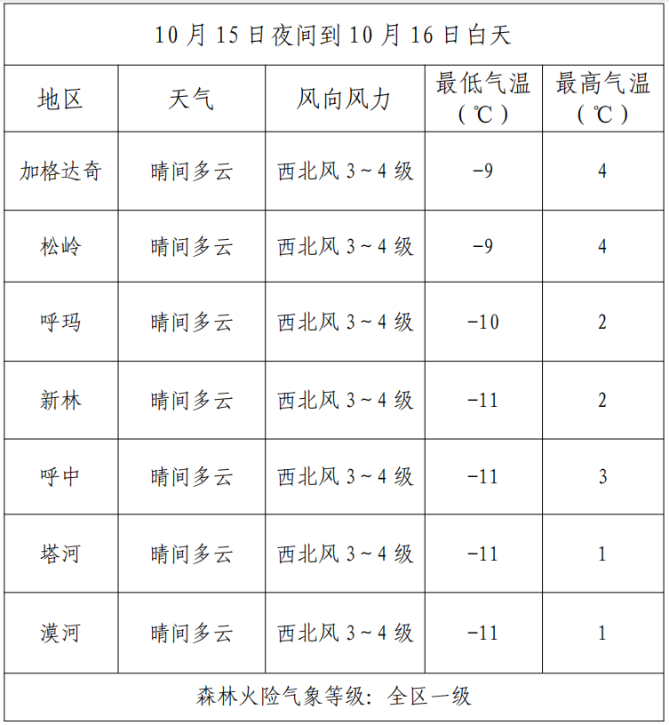 10月15日夜间到10月16日白天全区天气与森林火险预报