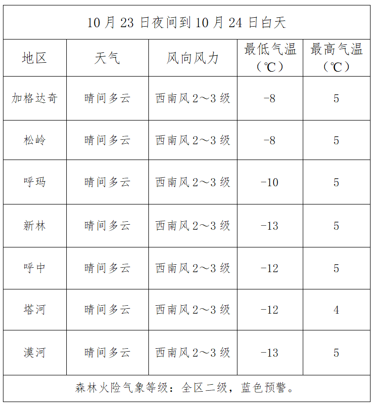 10月23日夜间到10月24日白天全区天气与森林火险预报