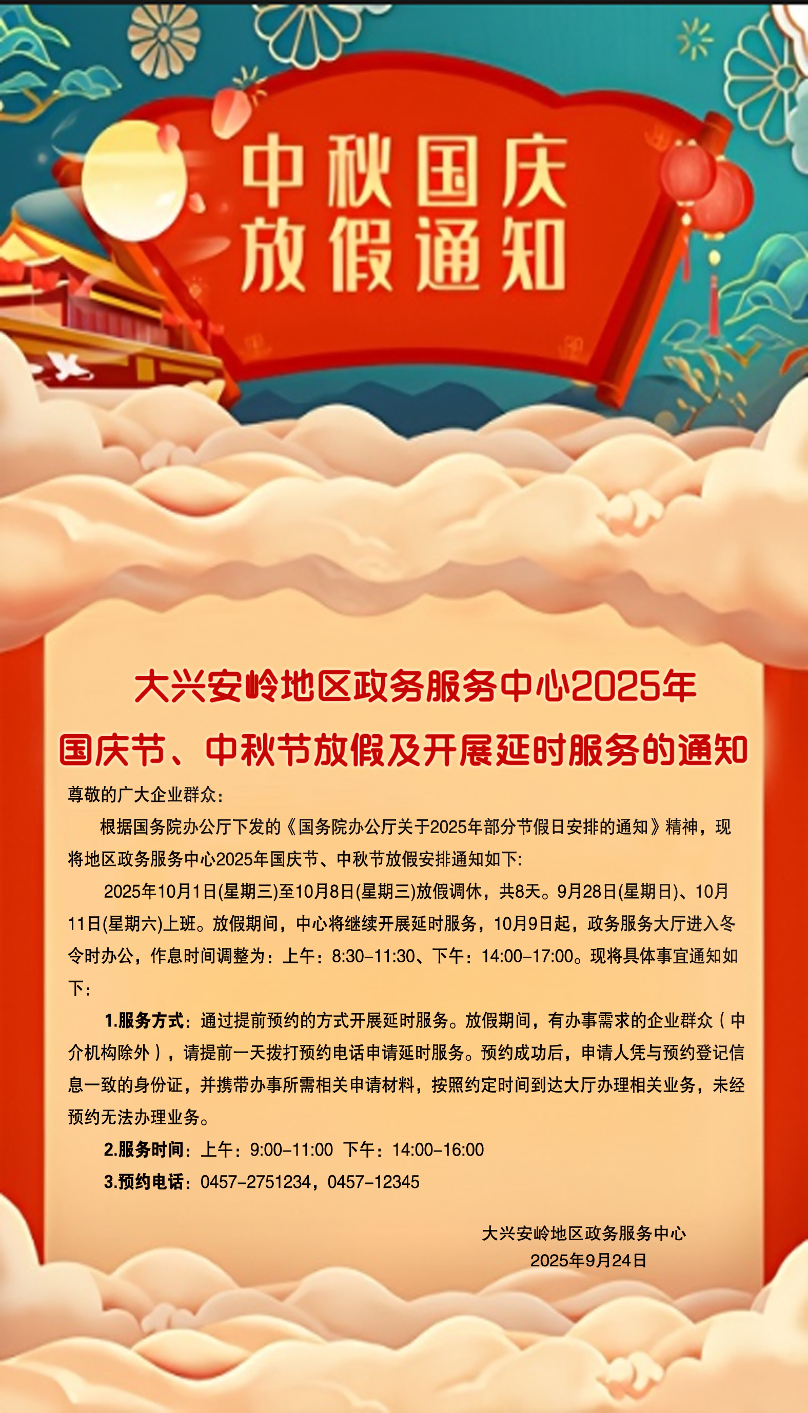 【大厅动态】大兴安岭地区政务服务中心2025年国庆节、中秋节放假安排通知