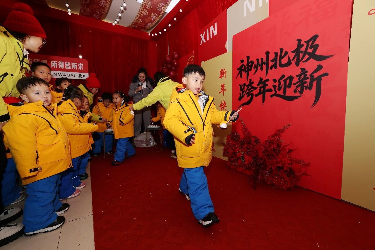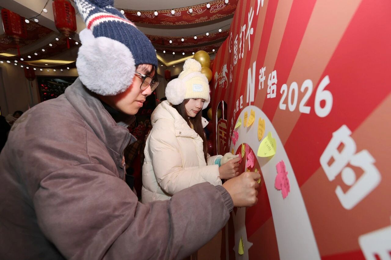 活动伊始,“最北暖屋话团圆”环节温情满溢,本地非遗传承人带来的原创歌曲宛转悠扬,《奔腾》等歌曲穿插其间,“蒙眼喂香蕉”“念歌词答歌名”等趣味游戏让现场笑声不断,“跨年心愿墙”贴满了游客的美好期许。“能和全国各地朋友一起在北极村跨年,还能体验这么多东北特色活动,太有意义了。”来自安徽的游客陈亚萍认真参与了“蒙眼喂香蕉”,手中的漠河文创奖品让她喜笑颜开。
