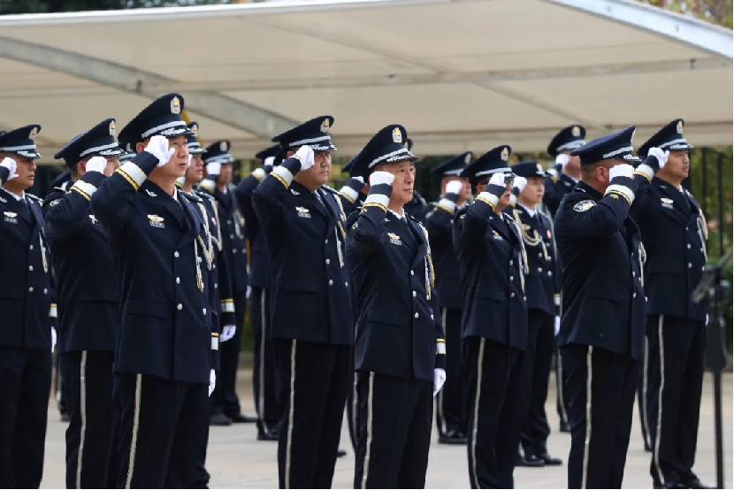 上午8时30分,国旗仪仗队队员迈着整齐划一、铿锵有力的步伐走向升旗台。在雄壮激昂的国歌声中,鲜艳的五星红旗冉冉升起、迎风飘扬。全体民警辅警昂首挺胸、庄严肃立,面向国旗行注目礼,表达对伟大祖国最真挚的祝福。升旗礼毕,掷地有声的入警誓词再次回荡、字字千钧,凝聚了全警为公安事业奋斗终身的磅礴之力、昂扬斗志。