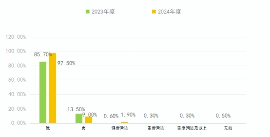 2024年大兴安岭地区有效监测天数为366天,其中环境空气质量指数(AQI)级别为一级的有324天,占总有效监测天数的88.5%,同比增加2.8%;二级的有33天,占9.0%,同比减少4.5%;全年达到二级的有357天,达标率为97.5%,同比减少1.7%。(详见表7-3)