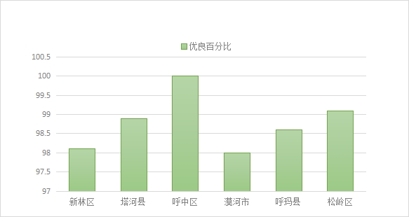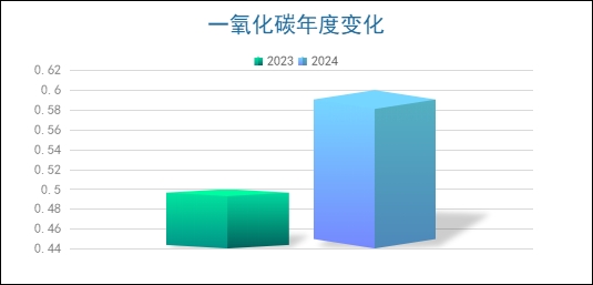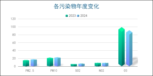 2024年大兴安岭地区主城区环境空气中二氧化硫(SO2)、二氧化氮(NO2)、一氧化碳(CO)、臭氧(O3日最大8小时平均)、可吸入颗粒物(PM10)、细颗粒物(PM2.5)六项主要污染物年平均浓度分别为:7μg/m3、9μg/m3、0.6mg/m3、91μg/m3、23μg/m3、18μg/m3。六项污染物年均浓度均满足国家环境空气质量二级标准。2024年主城区空气质量平均优良天数为357天,占比97.5%,与2023年同比下降了1.7%。二氧化氮(NO2)平均浓度较2023年同比无变化;臭氧(O3日最大8小时平均)平均浓度较2023年有所下降,下降了8.1%;一氧化碳(CO)、二氧化硫(SO2)、可吸入颗粒物(PM10)、细颗粒物(PM2.5)等其余主要污染物年平均浓度较2023年年均有所上升,分别上升了20.0%、16.7%、12.5%、4.5%。