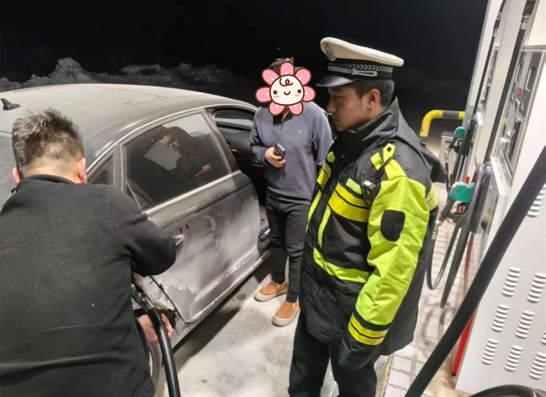 该路段距离最近的加油站不远,若等待拖车则耗时较长。为确保游客安全、尽快解决其困境,民警在确认操作合规的前提下,免费为游客先行加注少量备用油,随后驾车引领王先生前往附近加油站。加油期间,民警还贴心向王先生介绍了当地主要旅游路线、加油站分布及自驾出行安全注意事项,细致解答其出行疑问。