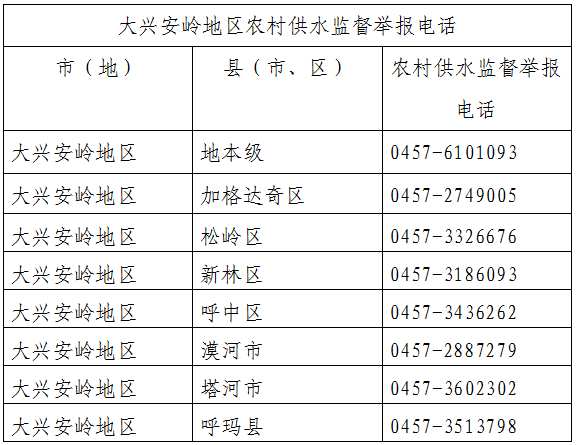为切实保障全区农村居民饮水安全,进一步畅通群众农村饮水安全监督举报渠道,2026年大兴安岭地区水务局重新统计地、县两级水行政主管部门农村供水监督举报电话,如发现农村供水工程运行管理、供水服务出现问题,可以通过以下监督举报电话进行投诉。