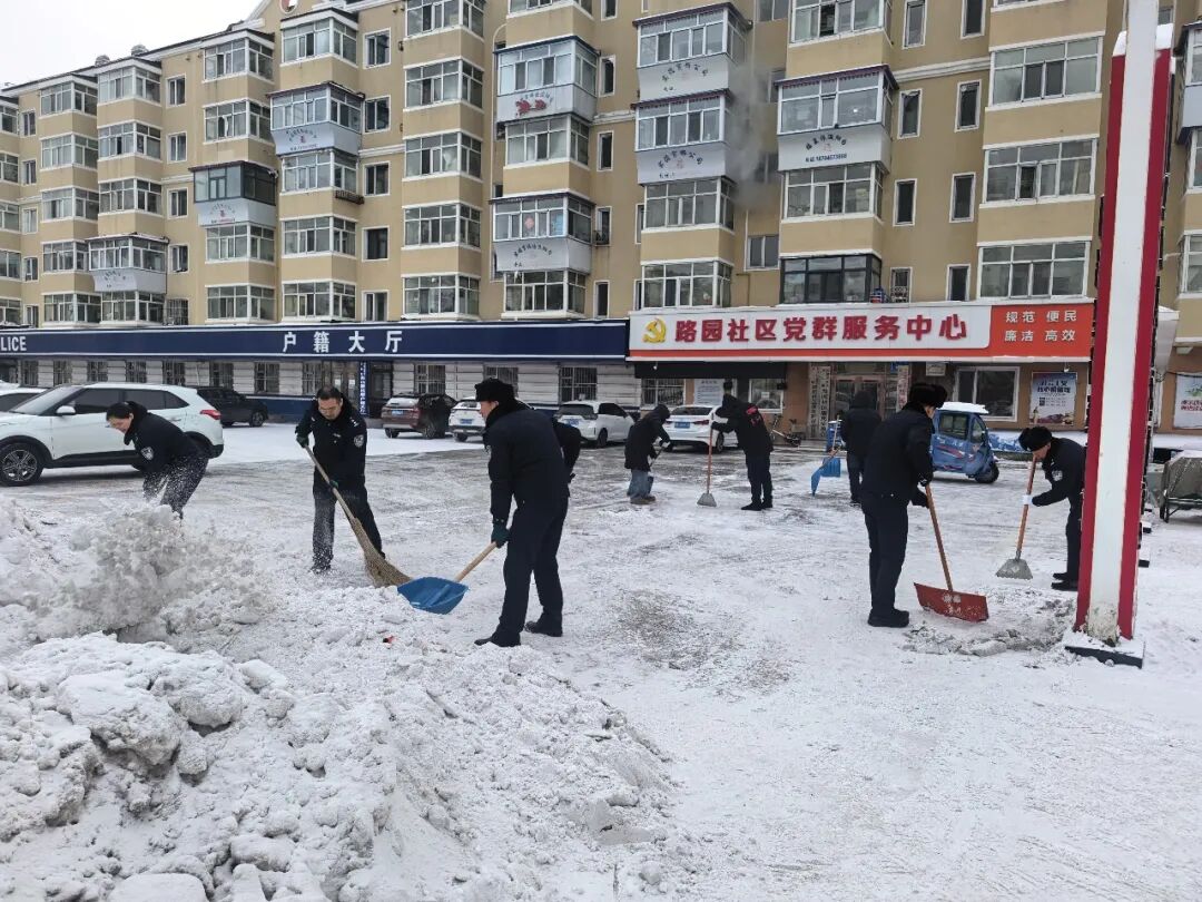 降雪过后,社区辖区内主次干道、居民小区出入口及公共广场被厚厚的积雪覆盖,部分路面结冰打滑,给老年人、儿童等特殊群体出行带来极大安全隐患。为保障群众出行安全,党员民警充分发挥先锋模范作用,与社区工作人员携带扫帚、雪铲等工具,重点对社区广场、小区出入口及主要通行路段的积雪、积冰进行集中清理。