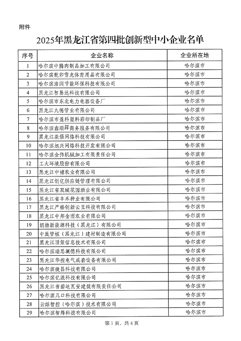 黑龙江省工业和信息化厅关于公布2025年黑龙江省第四批创新型中小企业名单的通知