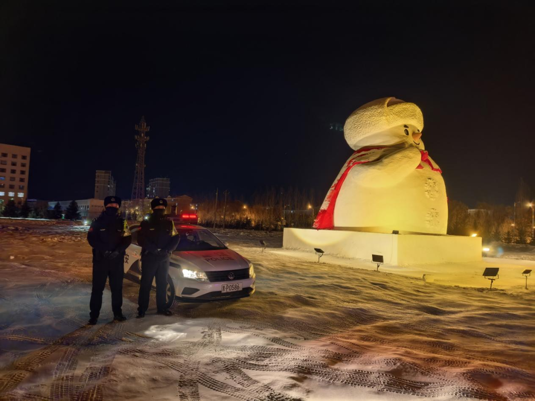 民警以车巡+步巡相结合的方式,围绕雪雕群、广场出入口、人流密集区域开展不间断巡逻,重点排查安全隐患、疏导现场人流、提醒群众看好随身财物,用脚步丈量责任,用坚守温暖寒夜。寒风吹拂,雪花零星飘落,民警佩戴反光袖标,肩灯闪烁,成为雪雕旁最亮眼的“平安标识”。巡逻途中,他们耐心提醒拍照打卡的市民“注意脚下防滑”,叮嘱带娃家长“看好孩子,避免走失”,对过往游客咨询的路线问题细致解答;同时紧盯雪雕周边设施安全,及时劝阻攀爬雪雕、追逐打闹等危险行为,全力保障雪雕景观完好和群众游玩安全。