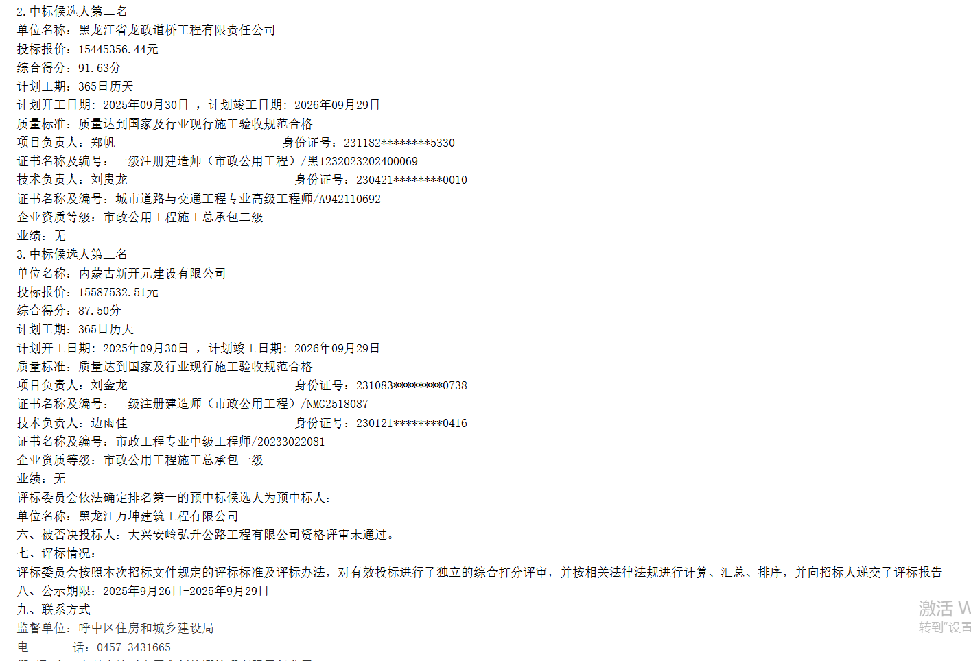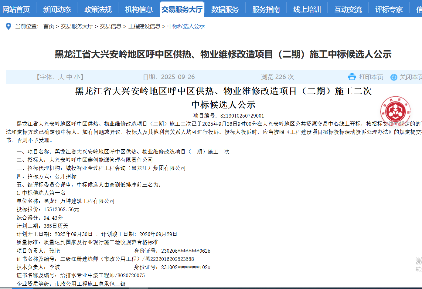 地区住建局、地区发改委,水务局,农业农村局等六部门为强化监管力度,联合创新《大兴安岭地区工程建设项目招标投标信息公开办法》,本次信息公示在向社会公开项目负责人的基础上,又对项目技术负责人信息进行了公示,通过健全完善公示内容,进一步提高了工程建设项目招标投标过程透明度。各成员单位积极组织开标项目按公示要求进行公示。9月26日,黑龙江省大兴安岭地区呼中区供热、物业维修改造项目(二期)在大兴安岭地区公共资源交易中心线上开标,同日,中标结果已将技术负责人信息在黑龙江省公共资源交易网公示。