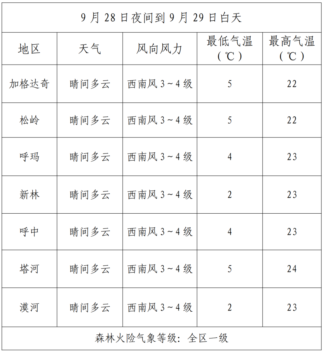 9月28日夜间到9月29日白天全区天气与森林火险预报