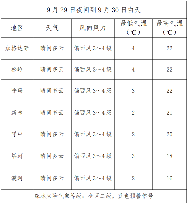 9月29日夜间到9月30日白天全区天气与森林火险预报