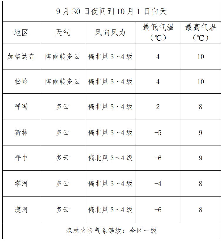 9月30日夜间到10月1日白天全区天气与森林火险预报