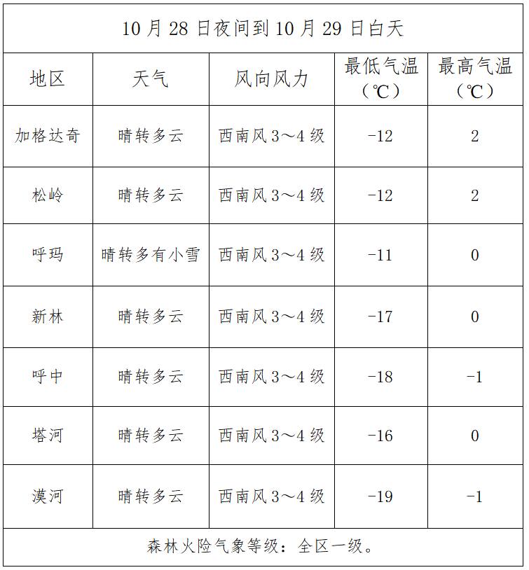 10月28日夜间到10月29日白天全区天气与森林火险预报