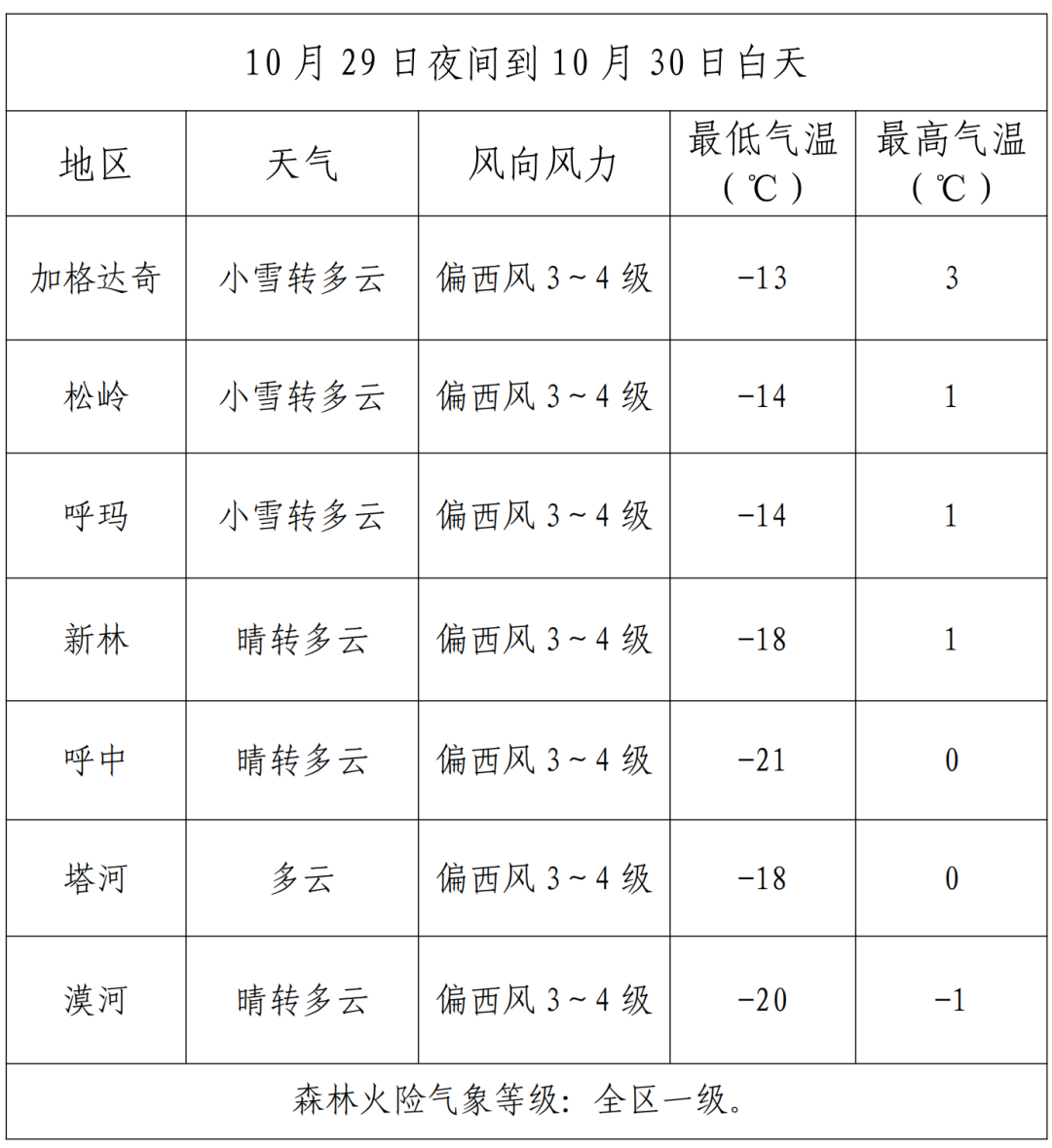 10月29日夜间到10月30日白天全区天气与森林火险预报